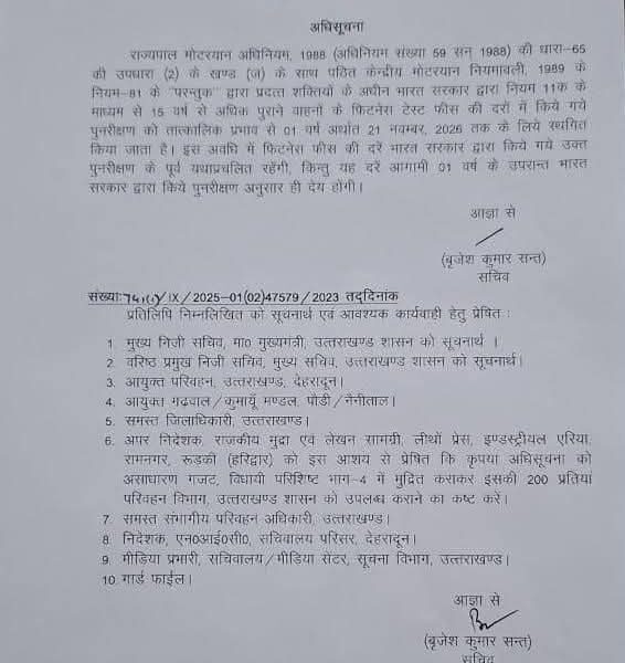 मुख्यमंत्री पुष्कर सिंह धामी के निर्देश पर राज्य सरकार ने उत्तराखंड के वाहन स्वामियों को महत्वपूर्ण राहत प्रदान करते हुए पुराने (15 वर्ष) कमर्शियल वाहनों की फिटनेस फीस में वृद्धि को आगामी 21 नवम्बर 2026 तक स्थगित कर दिया है। इस संबंध में परिवहन विभाग द्वारा अधिसूचना जारी कर दी गई है। अधिसूचना सचिव परिवहन श्री बृजेश कुमार संत द्वारा जारी की गई।